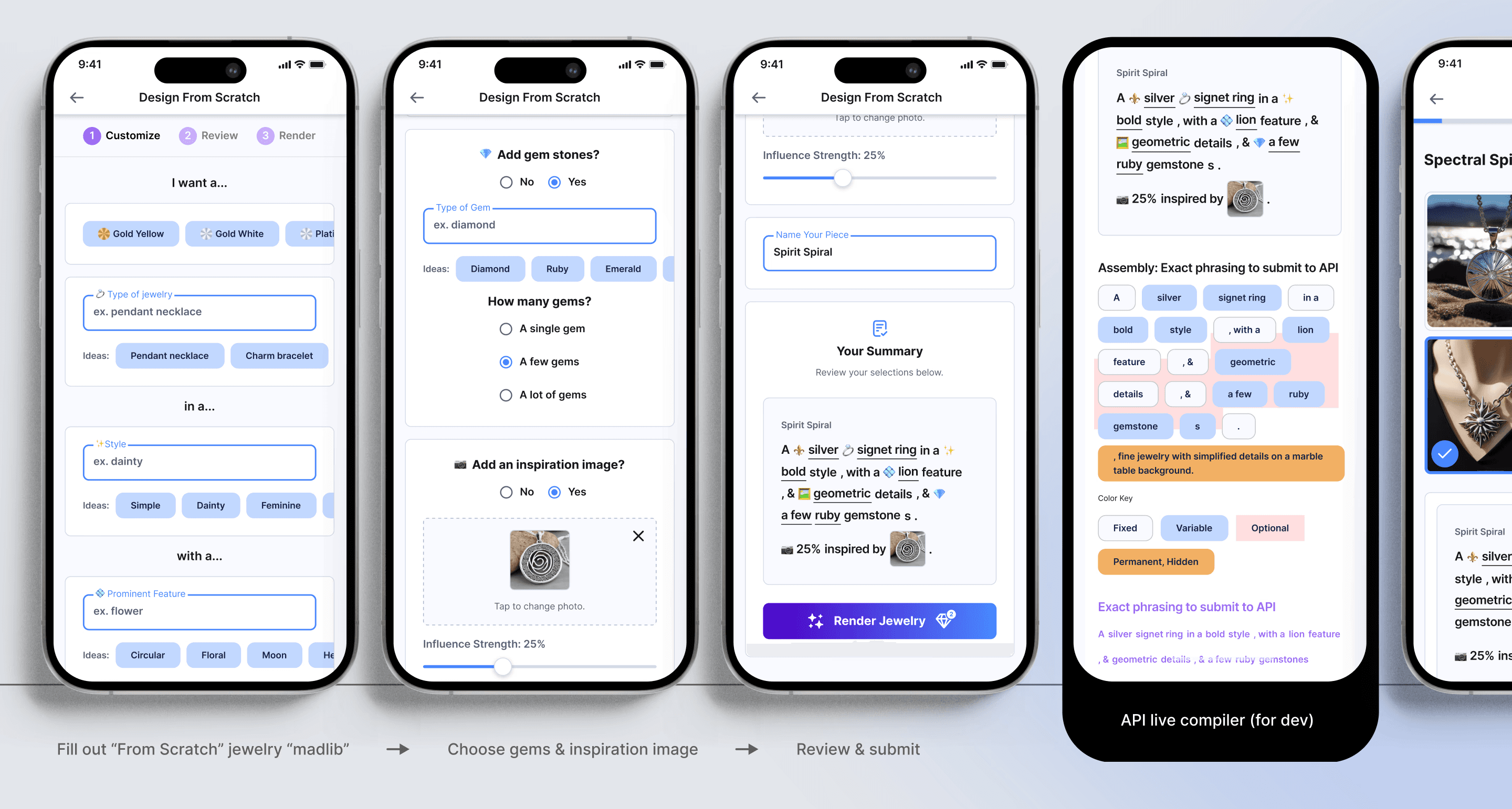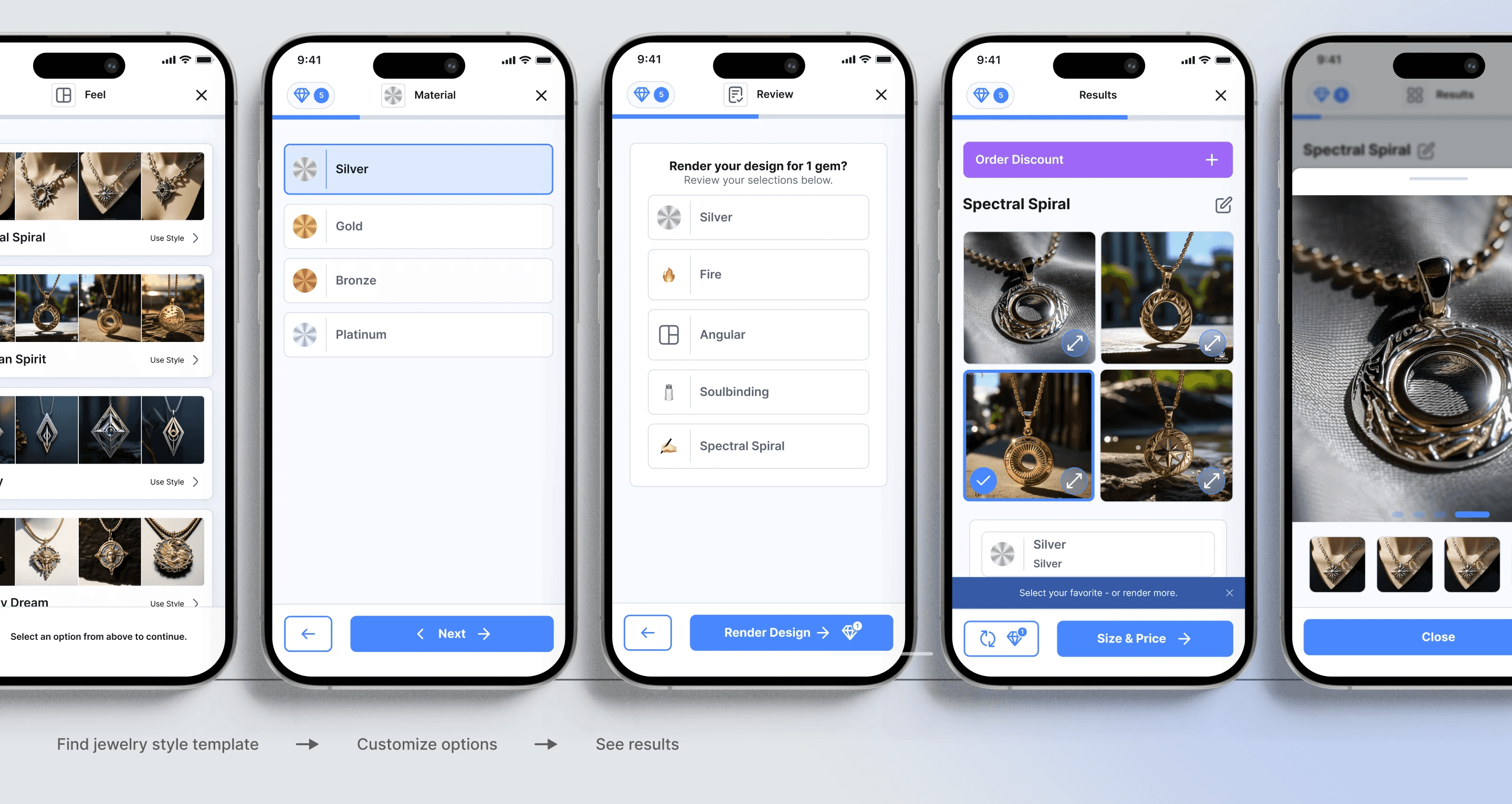 Users choose a template or start from scratch, customize details, and watch AI instantly generate unique jewelry concepts.