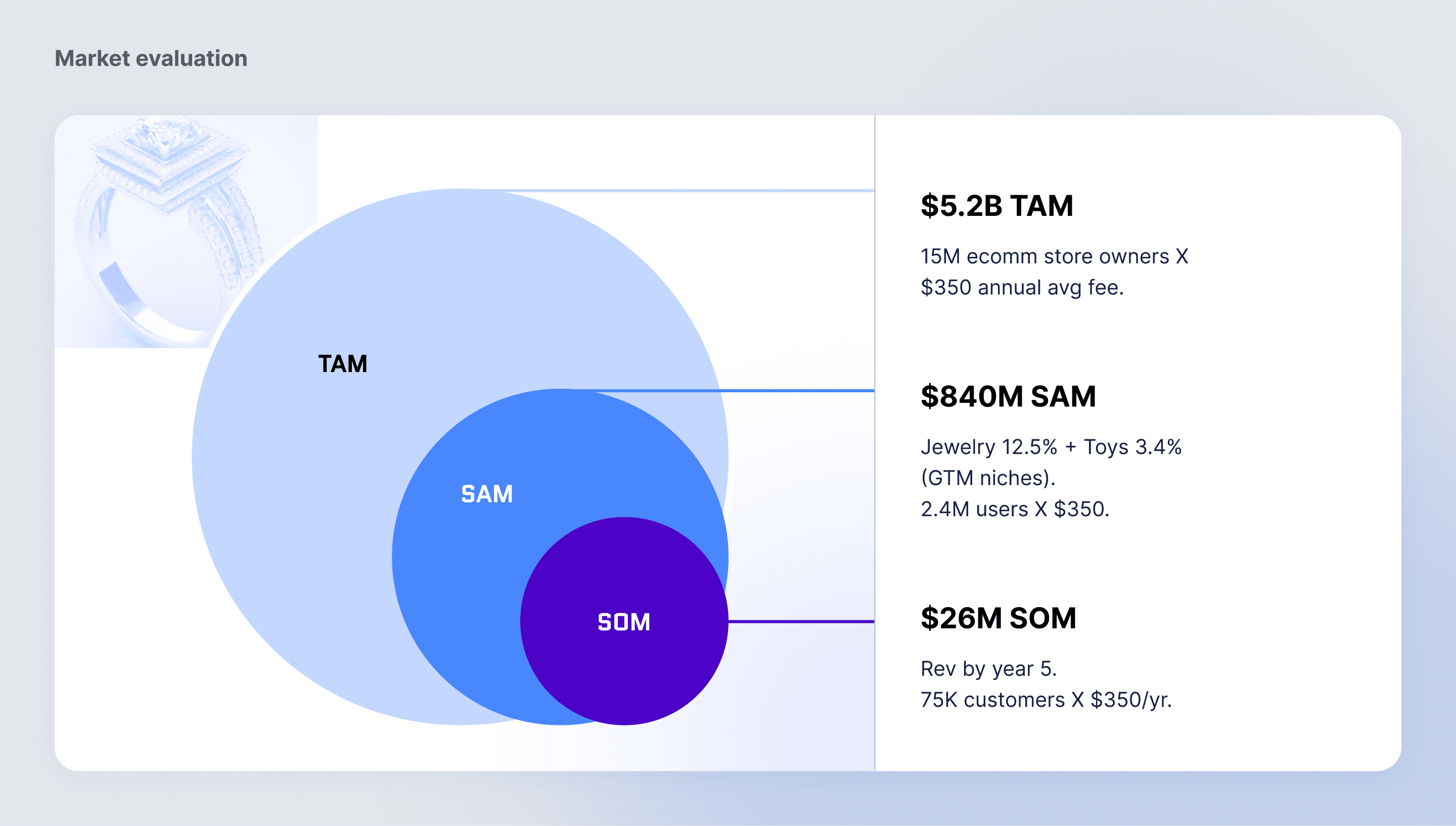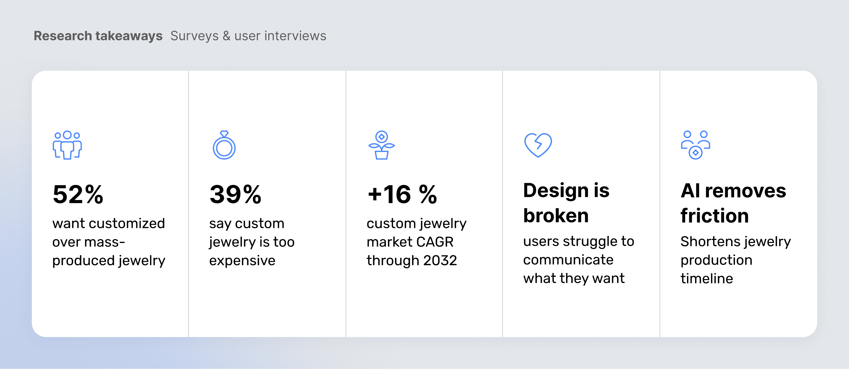 Market research confirmed the opportunity. The global personalized jewelry segment is valued at roughly 40 billion dollars and growing at an estimated 8 to 9 percent CAGR. When narrowed to North American mobile-first shoppers, the serviceable obtainable market is about 3 to 5 billion dollars, driven by rising interest in personalized fashion, accessible luxury, and AI assisted creativity.