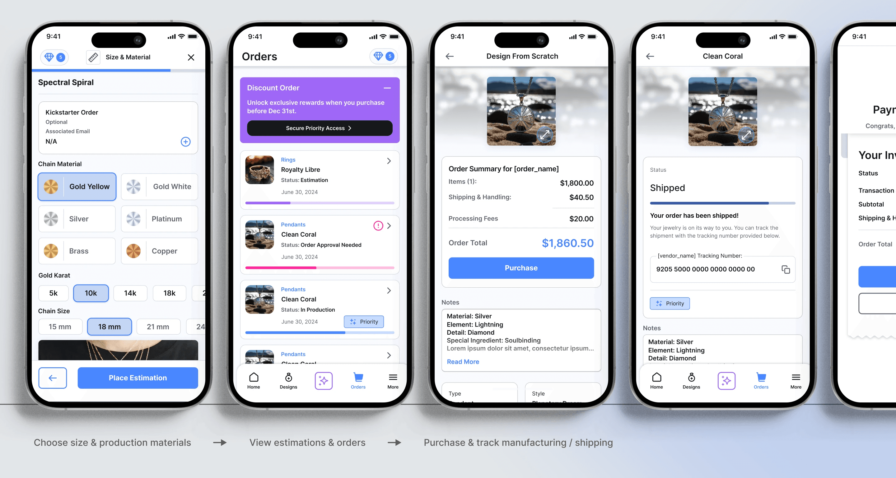 Clear material options, transparent pricing, and a flow that directs simple pieces to instant checkout while routing complex designs to jewelers for quotes. After purchase, users can track manufacturing and shipping.