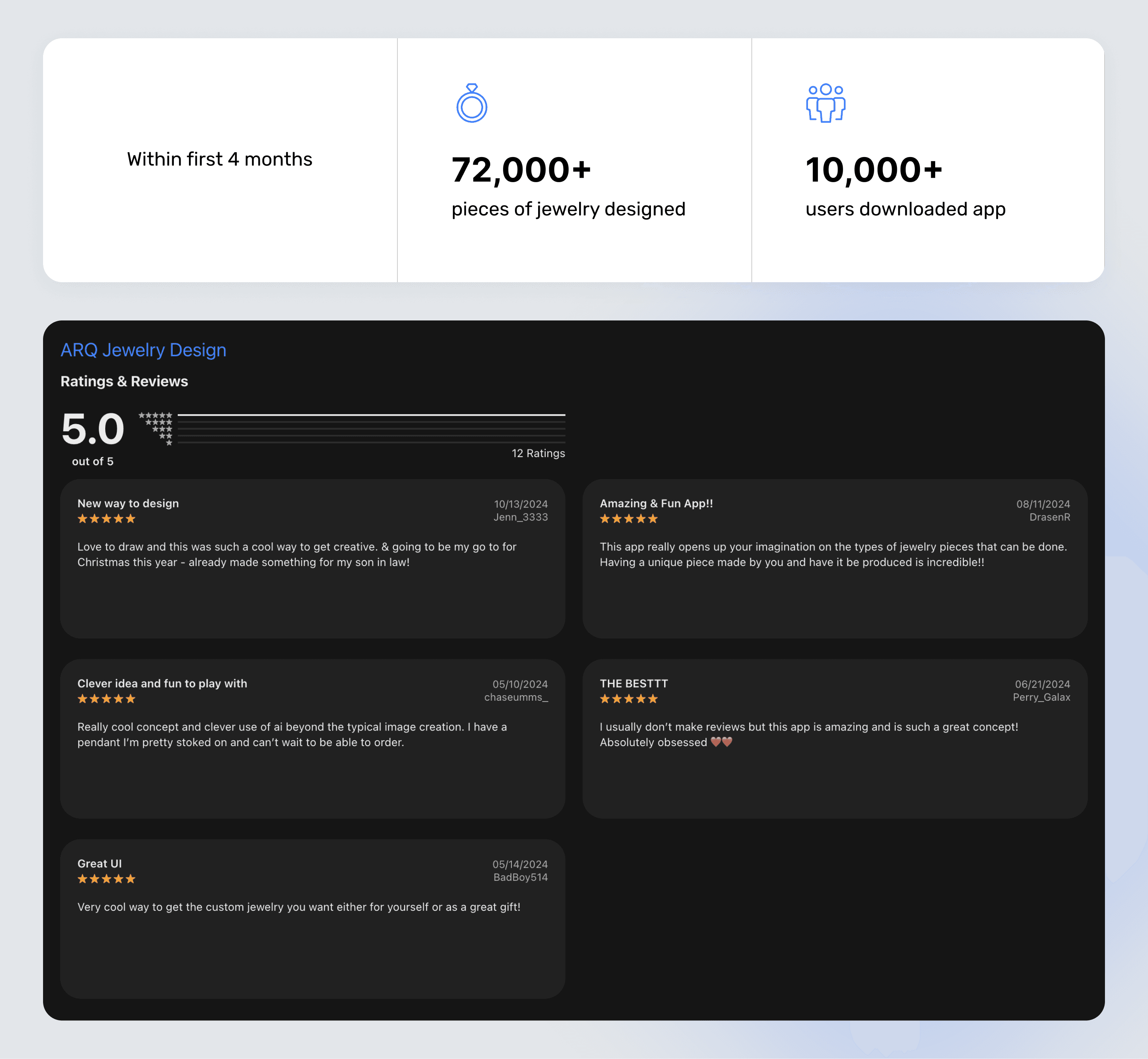 ARQ successfully launched as the world's first AI powered jewelry creation app. The platform introduced a new category of accessible custom jewelry and opened doors for partnerships with manufacturers and boutique designers.